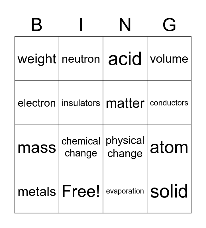 This bingo card has 21 words: Free!, proton, neutron, gas, evaporation, matter, weight, acid, physical change, conductors, mass, volume, solid, molecule, insulators, malleability, metals, chemical change, electron, atom and condensation.
