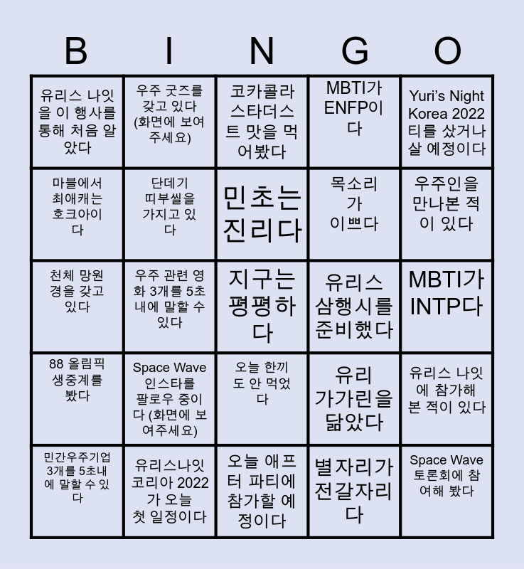 This bingo card has a free space and 24 words: Space Wave 인스타를 팔로우 중이다 (화면에 보여주세요), 유리스나잇 코리아 2022가 오늘 첫 일정이다, 민초는 진리다, 민간우주기업 3개를 5초내에 말할 수 있다, Yuri’s Night Korea 2022 티를 샀거나 살 예정이다, 유리스 나잇을 이 행사를 통해 처음 알았다, 마블에서 최애캐는 호크아이다, 우주 굿즈를 갖고 있다 (화면에 보여주세요), 유리스 삼행시를 준비했다, 오늘 한끼도 안 먹었다, 목소리가 이쁘다, 천체 망원경을 갖고 있다, 유리 가가린을 닮았다, 유리스 나잇에 참가해 본 적이 있다, 단데기 띠부씰을 가지고 있다, 별자리가 전갈자리다, MBTI가 INTP다, 코카콜라 스타더스트 맛을 먹어봤다, 우주인을 만나본 적이 있다, 우주 관련 영화 3개를 5초 내에 말할 수 있다, Space Wave 토론회에 참여해 봤다, 88 올림픽 생중계를 봤다, MBTI가 ENFP이다 and 오늘 애프터 파티에 참가할 예정이다.