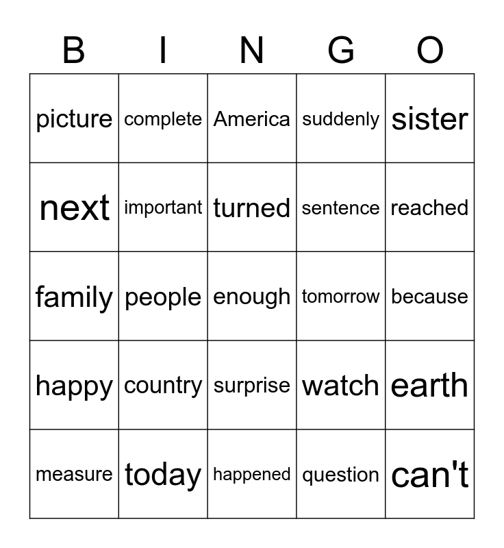 This bingo card has 30 words: today, brother, people, animal, picture, America, important, surprise, tomorrow, happened, because, enough, question, can't, reached, different, watch, happy, country, sister, family, inside, complete, sentence, next, suddenly, earth, measure, turned and state.