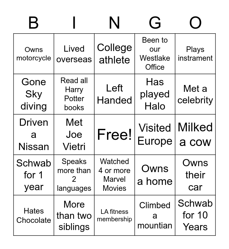 This bingo card has a free space and 24 words: Speaks more than 2 languages, More than two siblings, Left Handed, Hates Chocolate, Plays instrament, Owns motorcycle, Gone Sky diving, Lived overseas, Visited Europe, Watched 4 or more Marvel Movies, Has played Halo, Driven a Nissan, Owns a home, Owns their car, Read all Harry Potter books, Climbed a mountian, Milked a cow, College athlete, Met a celebrity, Met Joe Vietri, Schwab for 10 Years, Schwab for 1 year, Been to our Westlake Office and LA fitness membership.