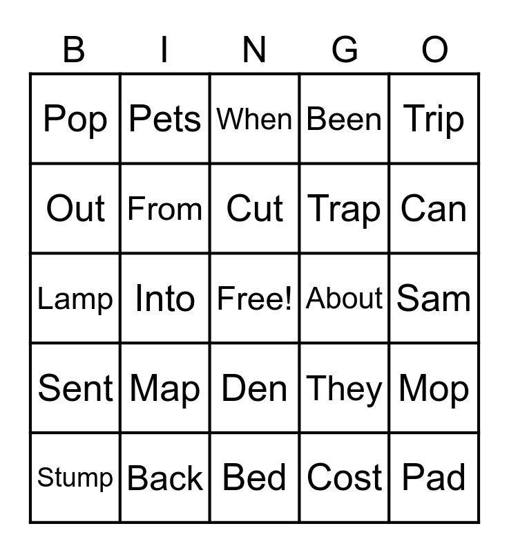 This bingo card has a free space and 24 words: Map, Back, Cut, Stump, Trip, Pop, Out, Pets, About, Den, Trap, Lamp, They, Mop, From, Cost, Sam, When, Can, Into, Pad, Sent, Been and Bed.