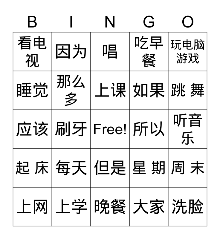 This bingo card has a free space and 24 words: 每天, 上学, 上课, 上网, 玩电脑游戏, 看电视, 睡觉, 因为, 所以, 但是, 如果, 应该, 星 期, 周 末, 那么多, 大家, 听音乐, 唱, 跳 舞, 刷牙, 洗脸, 起 床, 吃早 餐 and 晚餐.
