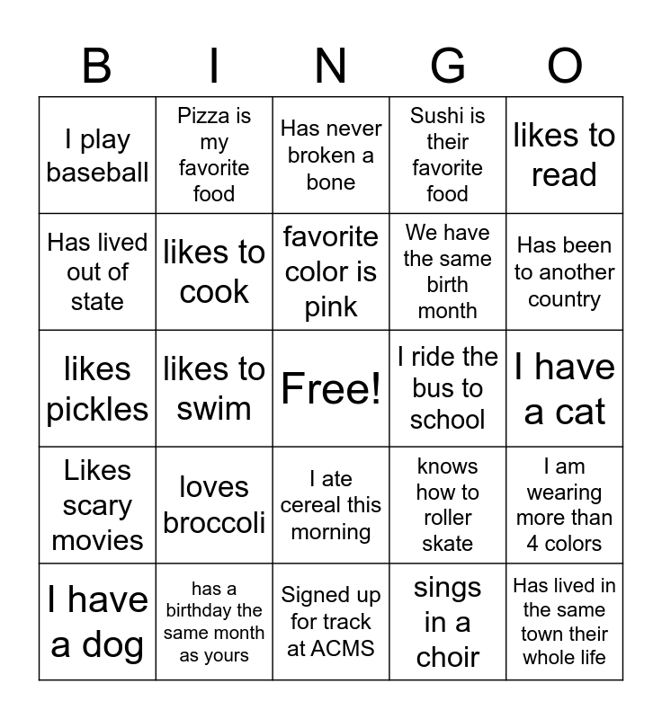This bingo card has a free space and 24 words: loves broccoli, has a birthday the same month as yours, favorite color is pink, I have a dog, likes to read, I play baseball, Has lived out of state, Pizza is my favorite food, I ride the bus to school, I ate cereal this morning, We have the same birth month, likes pickles, knows how to roller skate, I am wearing more than 4 colors, likes to cook, sings in a choir, I have a cat, Has never broken a bone, Has been to another country, likes to swim, Has lived in the same town their whole life, Likes scary movies, Sushi is their favorite food and Signed up for track at ACMS.