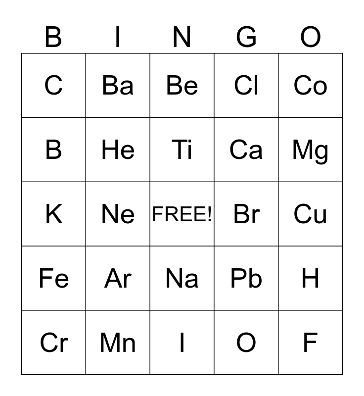 This bingo card has a free space and 25 words: Ar, I, Ti, Cr, Co, C, B, Ba, Br, Na, Ca, K, Pb, H, He, Ni, Cu, Be, Mg, Ne, F, Mn, Fe, Cl and O.