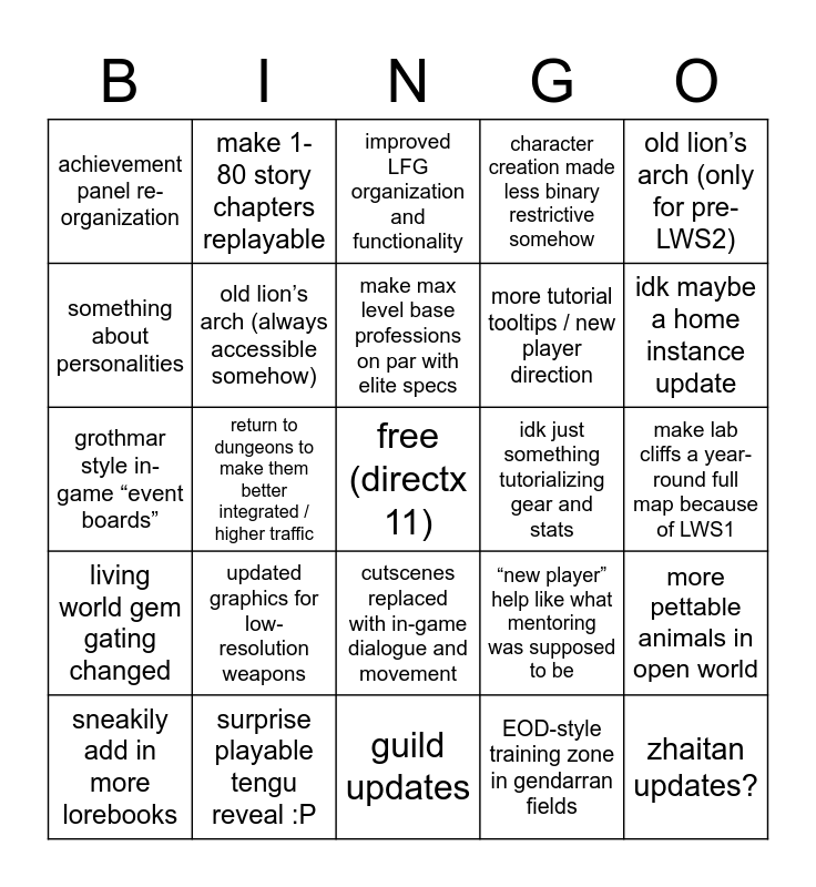 This bingo card has a free space and 24 words: updated graphics for low-resolution weapons, surprise playable tengu reveal :P, make max level base professions on par with elite specs, sneakily add in more lorebooks, old lion’s arch (only for pre-LWS2), achievement panel re-organization, something about personalities, make 1-80 story chapters replayable, idk just something tutorializing gear and stats, cutscenes replaced with in-game dialogue and movement, more tutorial tooltips / new player direction, grothmar style in-game “event boards”, “new player” help like what mentoring was supposed to be, more pettable animals in open world, old lion’s arch (always accessible somehow), EOD-style training zone in gendarran fields, make lab cliffs a year-round full map because of LWS1, improved LFG organization and functionality, idk maybe a home instance update, return to dungeons to make them better integrated / higher traffic, zhaitan updates?, living world gem gating changed, character creation made less binary restrictive somehow and guild updates.
