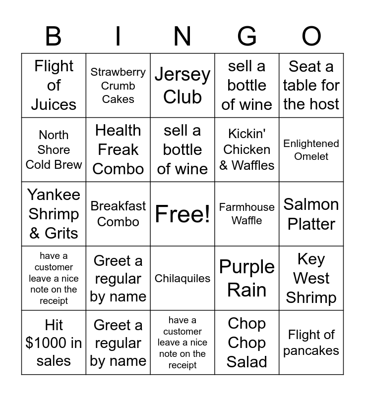 This bingo card has a free space and 25 words: Greet a regular by name, have a customer leave a nice note on the receipt, sell a bottle of wine, Hit $1000 in sales, Seat a table for the host, Flight of Juices, North Shore Cold Brew, Strawberry Crumb Cakes, Farmhouse Waffle, Chilaquiles, Kickin' Chicken & Waffles, Yankee Shrimp & Grits, Purple Rain, Key West Shrimp, Health Freak Combo, Victorious Vegan Combo, Salmon Platter, Jersey Club, Enlightened Omelet, Breakfast Combo, Flight of pancakes, Greet a regular by name, have a customer leave a nice note on the receipt, sell a bottle of wine and Chop Chop Salad.