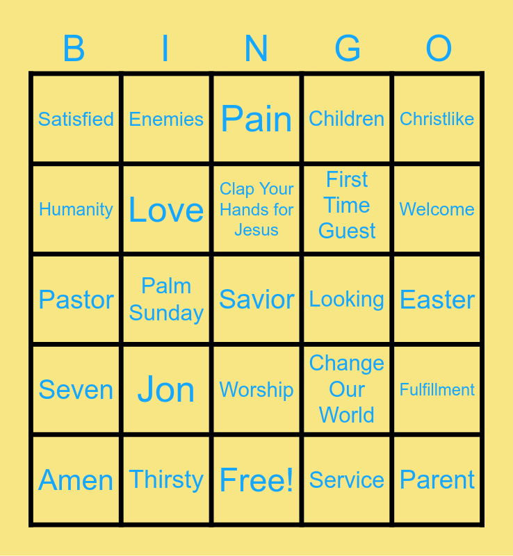 This bingo card has 25 words: Seven, Thirsty, Savior, Service, Christlike, Satisfied, Enemies, Pain, Looking, Fulfillment, Humanity, Love, Free!, Change Our World, Welcome, Amen, Palm Sunday, Clap Your Hands for Jesus, First Time Guest, Easter, Pastor, Jon, Worship, Children and Parent.