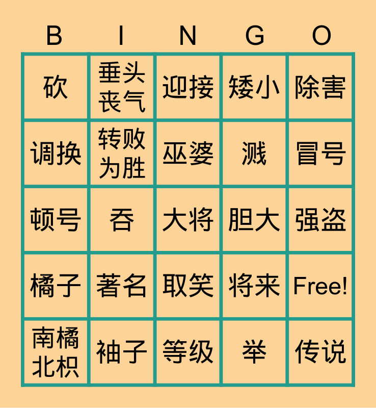 This bingo card has 52 words: 赛马, 大将, 各自 ( gèzì ), 等级, 著名, 输赢, 垂头丧气, 失败, 调换, 顺序, 转败为胜, 顺利, Free!, 将来, 寄信 (jì xìn), 反倒, 巫婆, 胆大, 打猎, 除害, 吞, 举, 砍, 溅, 勇敢, 传说, 政府, 感叹号, 冒号, 引号, 省略号, 矮小, 矮小, 旁边, 访问, 迎接, 袖子, 既然, 规矩, 犯人, 犯罪 fànzuì, 强盗, 橘子, 安居乐业, 取笑, 为难, 顿号, 顿号, 分号, 分号, 南橘北枳 and 没有规矩,不成方圆.