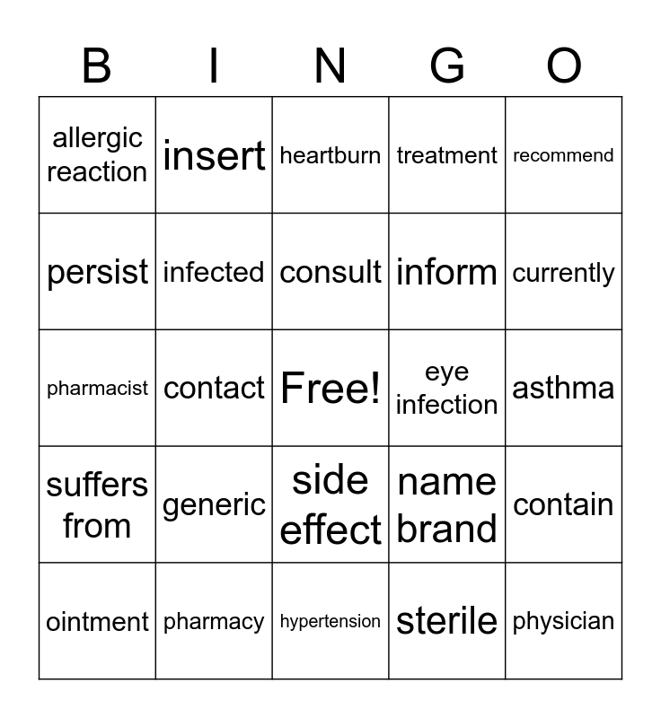 This bingo card has a free space and 34 words: vomit, sterile, dosage, drowsiness, suffers from, infected, recommend, ointment, insert, symptom, consult, heartburn, allergy, heartburn, eye infection, currently, pharmacy, pharmacist, generic, name brand, side effect, feeling nauseous, allergic reaction, asthma, hypertension, physician, treatment, warning, inform, persist, insomnia, contact, contain and chest pain.