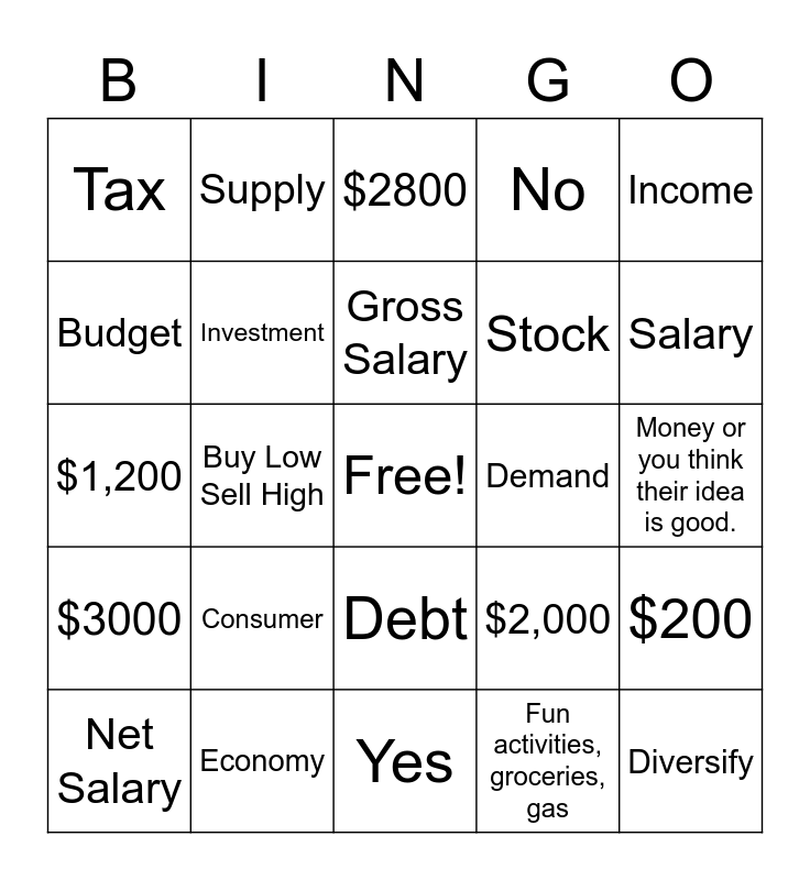 This bingo card has a free space and 24 words: Consumer, Economy, Gross Salary, Net Salary, Income, Tax, Budget, Supply, Demand, Debt, Stock, $1,200, $2,000, $200, Investment, Fun activities, groceries, gas, Money or you think their idea is good., $2800, Salary, Buy Low Sell High, Diversify, $3000, No and Yes.