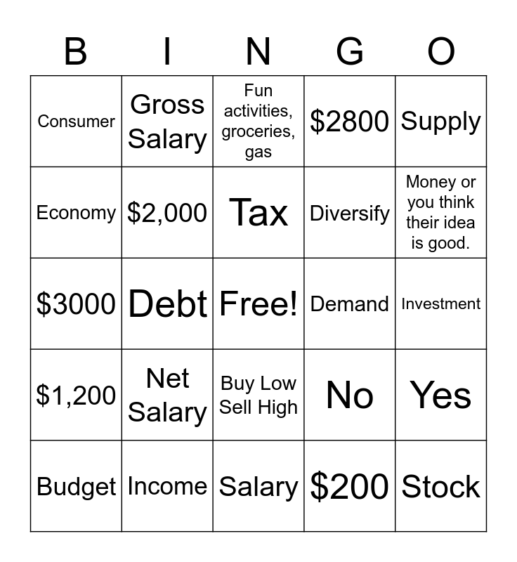 This bingo card has a free space and 24 words: Net Salary, Income, Tax, Budget, Supply, Consumer, Economy, Gross Salary, Demand, Buy Low Sell High, Diversify, $3000, No, Yes, $2,000, $200, Investment, Fun activities, groceries, gas, Money or you think their idea is good., Debt, Stock, $1,200, $2800 and Salary.