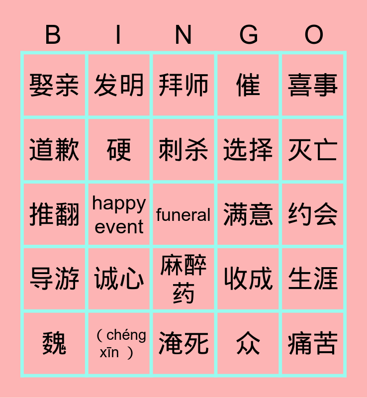 This bingo card has 56 words: 豹子, 魏, 管理, 娶亲, 淹死, 绅士, 硬, 新娘, 选择, 打扮, 催, 求饶, 水渠, canal, 危险, 主席, 喜事, happy event, 丧事, funeral, 满意, satisfied, pleased, 收成, 拜师, 功臣, 刺杀, to assassinate, 吃惊, 灭亡, 懂, 礼貌, 恭敬, 耐心, 教导, 约会, 道歉, 推翻, 大约, 导游, 发明, 麻醉药, 痛苦, 立志, 精通, 医术, 诚心, (chéng xīn ), 摸脉, 的确, 佩服, 众, 幸好, 默写, 告别, 生涯 and 山脉.