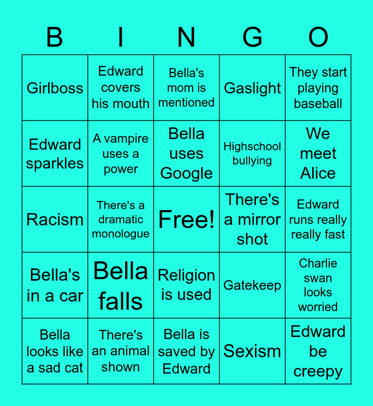 This bingo card has a free space and 24 words: Bella falls, There's an animal shown, Bella uses Google, Bella looks like a sad cat, They start playing baseball, Girlboss, Edward sparkles, Edward covers his mouth, There's a mirror shot, Religion is used, Highschool bullying, Racism, Gatekeep, Charlie swan looks worried, A vampire uses a power, Sexism, Edward runs really really fast, Bella's mom is mentioned, We meet Alice, There's a dramatic monologue, Edward be creepy, Bella's in a car, Gaslight and Bella is saved by Edward.