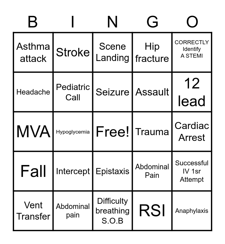 This bingo card has a free space and 24 words: Intercept, Abdominal pain, Seizure, Vent Transfer, CORRECTLY Identify A STEMI, Asthma attack, Headache, Stroke, Trauma, Epistaxis, Assault, MVA, Abdominal Pain, Successful IV 1sr Attempt, Pediatric Call, RSI, Cardiac Arrest, Scene Landing, 12 lead, Hypoglycemia, Anaphylaxis, Fall, Hip fracture and Difficulty breathing S.O.B.