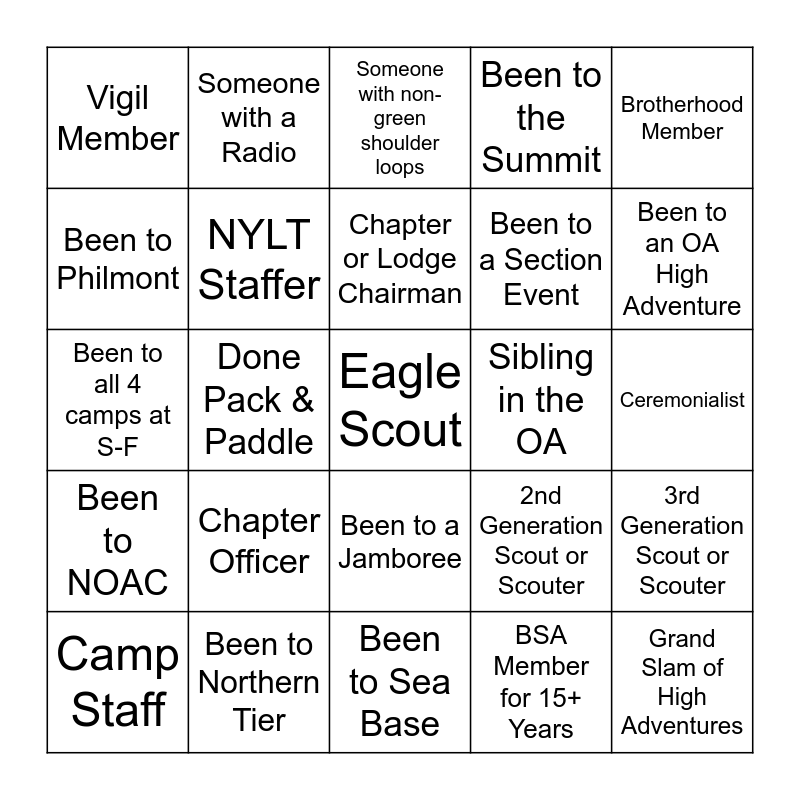 This bingo card has a free space and 24 words: Camp Staff, Chapter Officer, Chapter or Lodge Chairman, BSA Member for 15+ Years, Brotherhood Member, Vigil Member, Someone with a Radio, Someone with non-green shoulder loops, Sibling in the OA, Ceremonialist, Been to all 4 camps at S-F, NYLT Staffer, 2nd Generation Scout or Scouter, 3rd Generation Scout or Scouter, Been to Philmont, Been to Northern Tier, Been to Sea Base, Been to the Summit, Been to an OA High Adventure, Been to NOAC, Done Pack & Paddle, Been to a Jamboree, Been to a Section Event and Grand Slam of High Adventures.