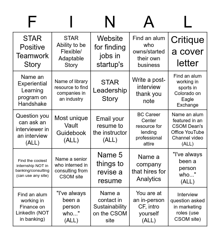 This bingo card has a free space and 24 words: Find an alum working in Finance on LinkedIn (NOT in banking), Name a senior who interned in consulting from CSOM site, STAR Leadership Story, You are at an in-person CF, intro yourself (ALL), Critique a cover letter, STAR Positive Teamwork Story, STAR Ability to be Flexible/ Adaptable Story, Website for finding jobs in startup's, BC Career Center resource for lending professional attire, Name an alum featured in an CSOM Dean's Office YouTube Channel video (ALL), Question you can ask an interviewer in an interview (ALL), Name of library resource to find companies in an industry, Name a company that hires for Analytics, "I've always been a person who..." (ALL), Name an Experiential Learning program on Handshake, "I've always been a person who..." (ALL), Name a contact in Sustainability on the CSOM site, Find an alum who owns/started their own business, Find an alum working in sports in Colorado on Eagle Exchange, Find the coolest internship NOT in banking/consulting (can use any site), Most unique Vault Guidebook (ALL), Name 5 things to revise a resume, Write a post-interview thank you note and Interview question asked in marketing roles (use CSOM site).