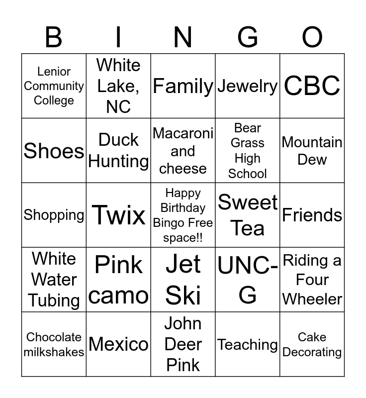 This bingo card has a free space and 24 words: Pink camo, Mexico, Macaroni and cheese, Chocolate milkshakes, CBC, Lenior Community College, Shoes, White Lake, NC, Sweet Tea, Jet Ski, Bear Grass High School, Shopping, UNC-G, Riding a Four Wheeler, Duck Hunting, Teaching, Friends, Family, Mountain Dew, Twix, Cake Decorating, White Water Tubing, Jewelry and John Deer Pink.