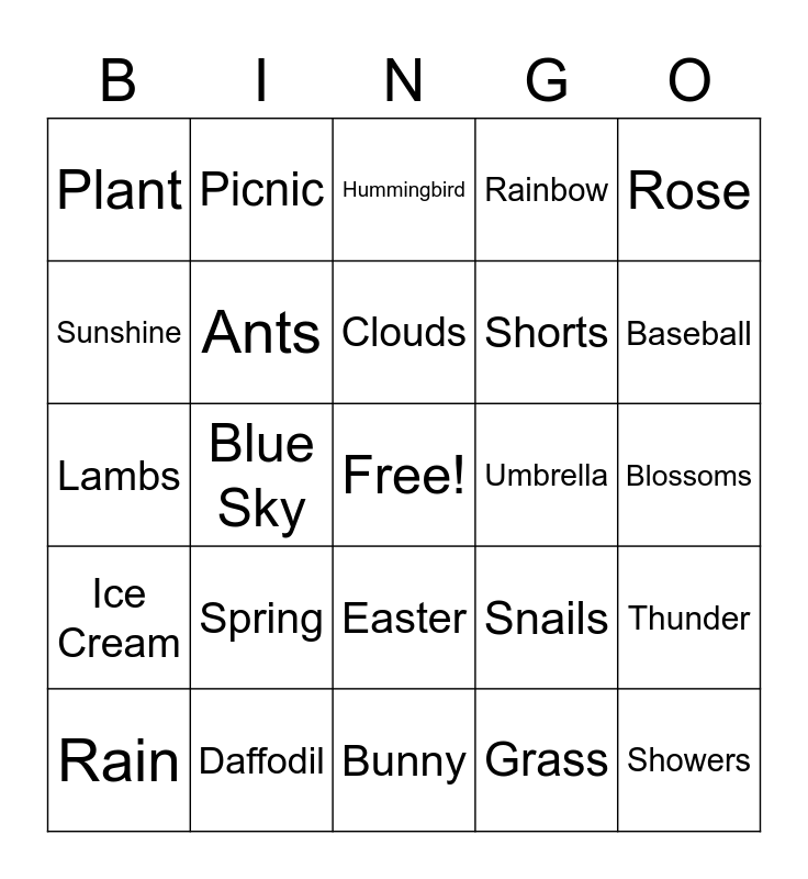 This bingo card has a free space and 44 words: April, Showers, Tulips, Rain, Robin, Grass, Hummingbird, Bees, Rose, Daffodil, Rainbow, Umbrella, Easter, Spring, Trees, Bunny, Sun Burn, Lambs, Swimming, Baseball, Picnic, Biking, Garden, Plant, Warm, Blossoms, Walks, Butterflies, Snails, Ice Cream, Scooters, Thunder, Lightning, Hiking, Blue Sky, Strawberries, New Birth, Colored Eggs, Clouds, Sunshine, Shorts, Sandals, Ants and Outside.