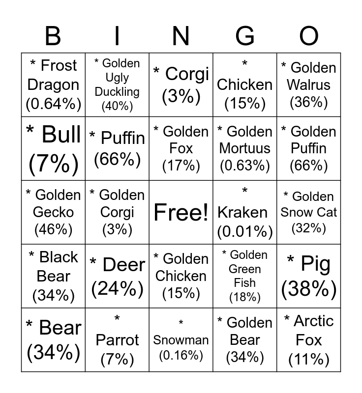 This bingo card has a free space and 120 words: * Bunny (28%), * Cat (28%), * Dalmatian (3%), * Dog (28%), * White Bunny (3%), * Chick (8%), * Chicken (15%), * Cow (38%), * Pig (38%), * Noob (0.23%), * Golden Bunny (28%), * Golden Cat (28%), * Golden Dalmatian (3%), * Golden Dog (28%), * Golden White Bunny (14%), * Golden Chick (8%), * Golden Chicken (15%), * Golden Cow (38%), * Golden Pig (38%), * Golden Noob (0.23%), * Bear (34%), * Corgi (3%), * Fox (17%), * Lamb (34%), * Monkey (12%), * Black Bear (34%), * Parrot (7%), * Raccoon (24%), * Squirrel (34%), * Tiger (2%), * Golden Bear (34%), * Golden Corgi (3%), * Golden Fox (17%), * Golden Lamb (34%), * Golden Monkey (12%), * Golden Black Bear (34%), * Golden Parrot (7%), * Golden Raccoon (24%), * Golden Squirrel (34%), * Golden Tiger (2%), * Blue Fish (18%), * Goldfish (5%), * Green Fish (18%), * Hydra (0.4%), * Turtle (59%), * Ducky (16%), * Flamingo (40%), * Kraken (0.01%), * Shark (4%), * Ugly Duckling (40%), * Golden Blue Fish (18%), * Golden Goldfish (5%), * Golden Green Fish (18%), * Golden Hydra (0.01%), * Golden Turtle (59%), * Golden Ducky (16%), * Golden Flamingo (40%), * Golden Kraken (0.01%), * Golden Shark (4%), * Golden Ugly Duckling (40%), * Elephant (46%), * Gecko (46%), * Griffin (2%), * Happy Rock (7%), * Bat (61%), * Bull (7%), * Immortuus (0.37%), * Mortuus (0.63%), * Orange Gecko (31%), * Golden Elephant (46%), * Golden Gecko (46%), * Golden Griffin (2%), * Golden Happy Rock (7%), * Golden Bat (61%), * Golden Bull (7%), * Golden Immortuus (0.37%), * Golden Mortuus (0.63%), * Golden Orange Gecko (31%), * Arctic Fox (11%), * Deer (24%), * Frost Dragon (0.64%), * Snow Cat (32%), * Snow Dog (32%), * Penguin (14%), * Polar Bear (36%), * Seal (14%), * Snowman (0.16%), * Walrus (36%), * Golden Arctic Fox (11%), * Golden Deer (24%), * Golden Frost Dragon (0.64%), * Golden Snow Cat (32%), * Golden Snow Dog (32%), * Golden Penguin (14%), * Golden Polar Bear (36%), * Golden Seal (14%), * Golden Snowman (0.16%), * Golden Walrus (36%), * Husky (4%), * Icemortuus (0.17%), * Ice Slime (11%), * Snow Leopard (42%), * Snow Squirrel (42%), * Angry Yeti (0.2%), * Cheerful Yeti (0.2%), * Puffin (66%), * Snow Ram (33%), * Golden Husky (4%), * Golden Icemortuus (0.17%), * Golden Ice Slime (11%), * Golden Snow Leopard (42%), * Golden Snow Squirrel (42%), * Golden Angry Yeti (0.2%), * Golden Cheerful Yeti (0.2%), * Golden Puffin (66%), * Golden Snow Ram (33%), * Dominus Empyreus (13%), * Dominus Frigidus (43%), * Dominus Infernus (43%) and * Domortuus (1%).