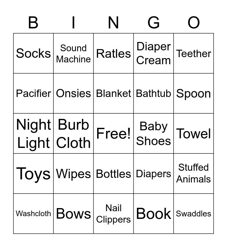 This bingo card has a free space and 24 words: Wipes, Bows, Blanket, Washcloth, Teether, Socks, Pacifier, Sound Machine, Baby Shoes, Bottles, Bathtub, Night Light, Diapers, Stuffed Animals, Onsies, Book, Towel, Ratles, Spoon, Burb Cloth, Swaddles, Toys, Diaper Cream and Nail Clippers.