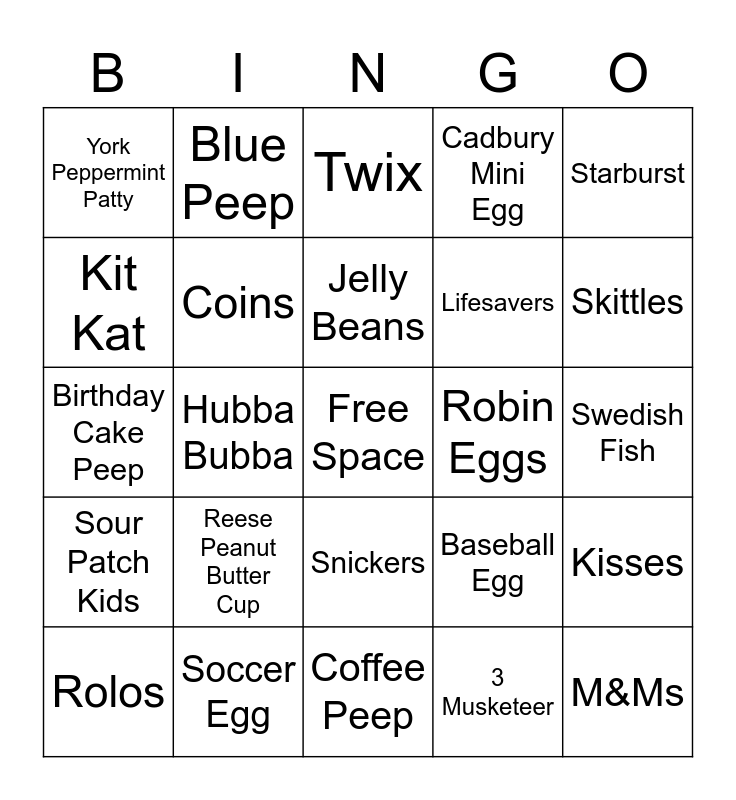 This bingo card has a free space and 24 words: Reese Peanut Butter Cup, Soccer Egg, Jelly Beans, Rolos, Starburst, York Peppermint Patty, Kit Kat, Blue Peep, Robin Eggs, Snickers, Lifesavers, Birthday Cake Peep, Baseball Egg, Kisses, Coins, 3 Musketeer, Swedish Fish, Twix, Skittles, Hubba Bubba, M&Ms, Sour Patch Kids, Cadbury Mini Egg and Coffee Peep.