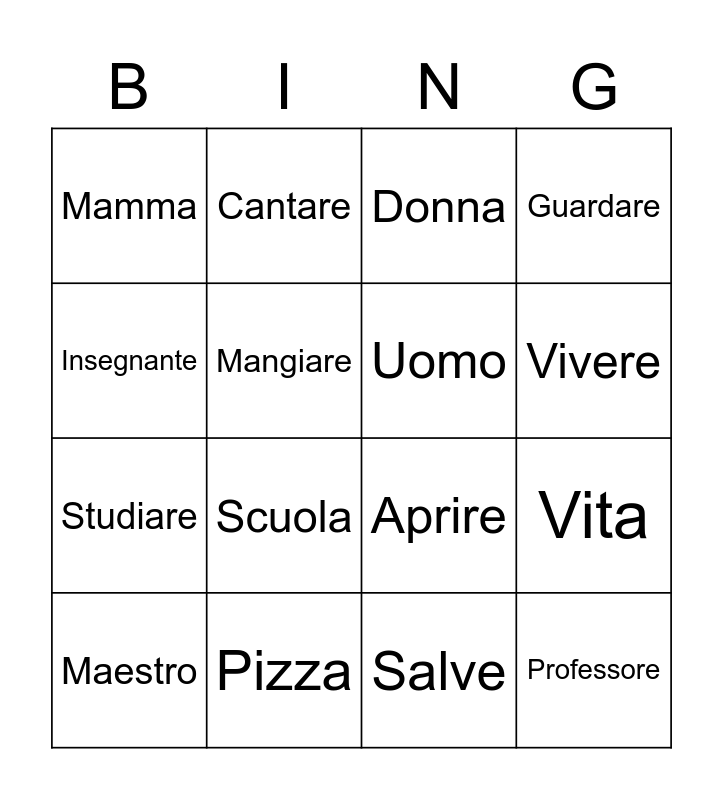This bingo card has 31 words: ITA, Amore, Vita, Cane, Mamma, Donna, Uomo, Pace, Pizza, Ciao, Salve, Maestro, Studente, Alunno, Scuola, Penna, Matita, Gomma, Professore, Professoressa, Insegnante, Amare, Parlare, Cantare, Studiare, Mangiare, Guardare, Aprire, Leggere, Vivere and Sognare.