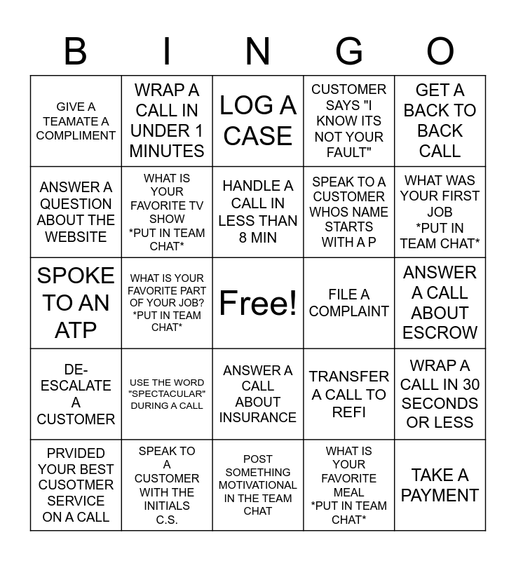 This bingo card has a free space and 24 words: USE THE WORD "SPECTACULAR" DURING A CALL, SPEAK TO A CUSTOMER WITH THE INITIALS C.S., HANDLE A CALL IN LESS THAN 8 MIN, PRVIDED YOUR BEST CUSOTMER SERVICE ON A CALL, GET A BACK TO BACK CALL, GIVE A TEAMATE A COMPLIMENT, ANSWER A QUESTION ABOUT THE WEBSITE, WRAP A CALL IN UNDER 1 MINUTES, FILE A COMPLAINT, ANSWER A CALL ABOUT INSURANCE, SPEAK TO A CUSTOMER WHOS NAME STARTS WITH A P, SPOKE TO AN ATP, TRANSFER A CALL TO REFI, WRAP A CALL IN 30 SECONDS OR LESS, WHAT IS YOUR FAVORITE TV SHOW *PUT IN TEAM CHAT*, WHAT IS YOUR FAVORITE MEAL *PUT IN TEAM CHAT*, ANSWER A CALL ABOUT ESCROW, LOG A CASE, WHAT WAS YOUR FIRST JOB *PUT IN TEAM CHAT*, WHAT IS YOUR FAVORITE PART OF YOUR JOB? *PUT IN TEAM CHAT*, TAKE A PAYMENT, DE-ESCALATE A CUSTOMER, CUSTOMER SAYS "I KNOW ITS NOT YOUR FAULT" and POST SOMETHING MOTIVATIONAL IN THE TEAM CHAT.