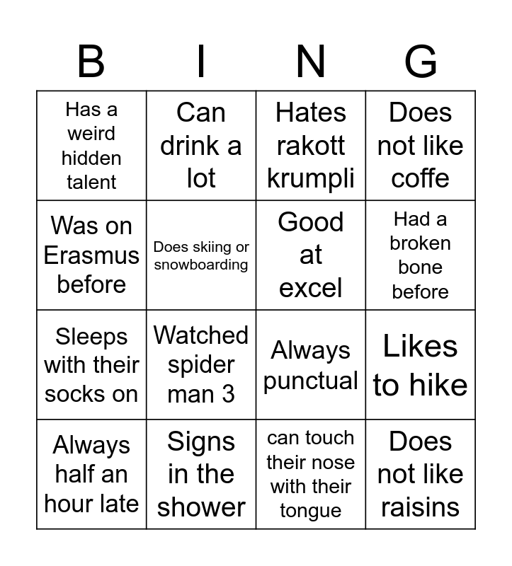 This bingo card has 16 words: Signs in the shower, Likes to hike, Hates rakott krumpli, Has a weird hidden talent, Sleeps with their socks on, Can drink a lot, Always punctual, can touch their nose with their tongue, Was on Erasmus before, Does skiing or snowboarding, Always half an hour late, Does not like coffe, Watched spider man 3, Had a broken bone before, Good at excel and Does not like raisins.