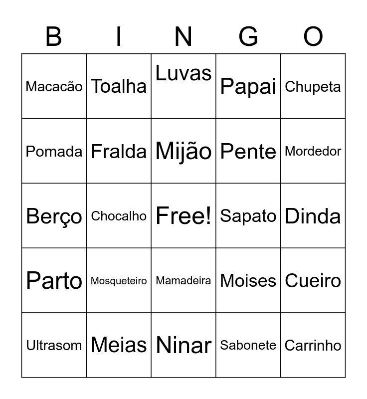 This bingo card has a free space and 35 words: Vó, Vô, Mamãe, Fralda, Mamadeira, Papai, Pomada, Body, Mijão, Lençol, Berço, Chupeta, Bico, Babador, Macacão, Sapato, Sabonete, Chocalho, Parto, Carrinho, Moises, Ultrasom, Cueiro, Meias, Luvas, Mordedor, Travesseiro, Bebê, Pente, Dinda, Andador, Ninar, Mosqueteiro, Toalha and Talco.