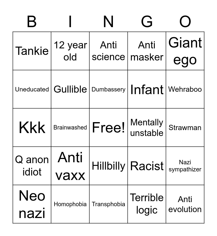This bingo card has a free space and 24 words: Anti vaxx, Homophobia, Dumbassery, Neo nazi, Giant ego, Tankie, Uneducated, 12 year old, Mentally unstable, Hillbilly, Infant, Kkk, Racist, Nazi sympathizer, Gullible, Terrible logic, Strawman, Anti science, Wehraboo, Brainwashed, Anti evolution, Q anon idiot, Anti masker and Transphobia.