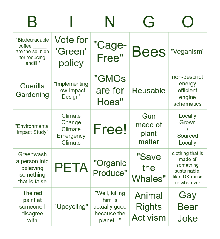 This bingo card has a free space and 24 words: PETA, "Upcycling", "GMOs are for Hoes", The red paint at someone I disagree with, "Veganism", "Biodegradable coffee _____ are the solution for reducing landfill", Guerilla Gardening, Vote for 'Green' policy, Gun made of plant matter, "Organic Produce", Reusable, "Environmental Impact Study", "Save the Whales", clothing that is made of something sustainable, like IDK moss or whatever, "Implementing Low-Impact Design", Animal Rights Activism, Locally Grown / Sourced Locally, "Cage-Free", non-descript energy efficient engine schematics, Climate Change Climate Emergency Climate, Gay Bear Joke, Greenwash a person into believing something that is false, Bees and "Well, killing him is actually good because the planet...".