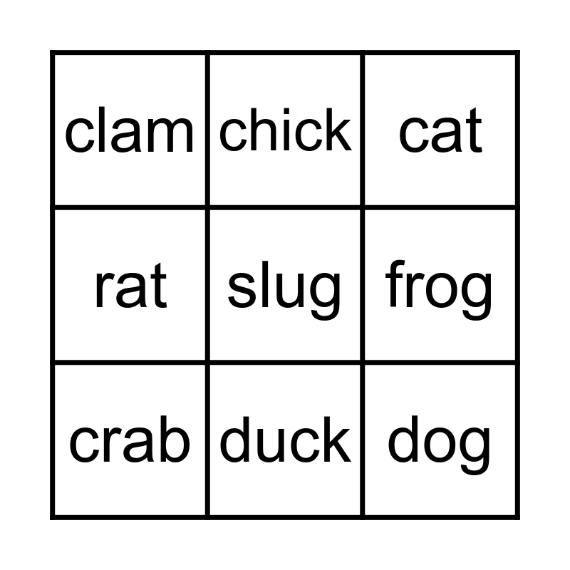This bingo card has a free space and 8 words: frog, cat, chick, crab, clam, dog, rat and duck.