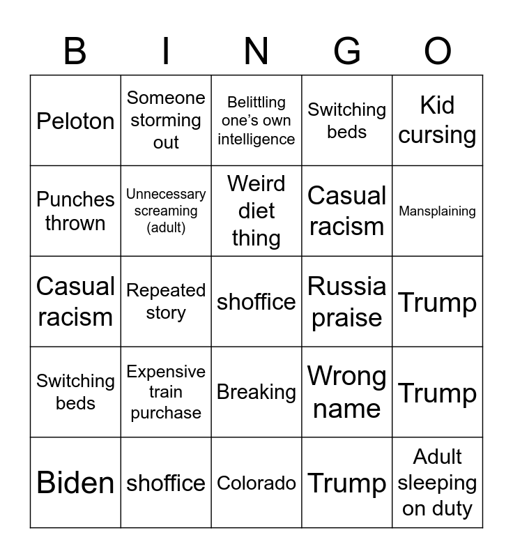 ⚠ This card has duplicate items: Trump (5), Peloton (2), Colorado (2), Unnecessary screaming (kid) (2), Unnecessary screaming (adult) (2), Punches thrown (2), Casual racism (2), Child abandonment (2), Switching beds (2), Adult sleeping on duty (2), Major injury (2), Someone storming out (2), Possible drowning (2), Kid cursing (2), Repeated story (2), Expensive train purchase (2), shoffice (2), Electric cars (2), Wrong name (2), Belittling one’s own intelligence (2), Mansplaining (2), Weird diet thing (2)