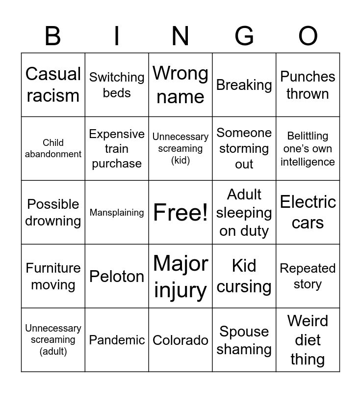 This bingo card has a free space and 25 words: Peloton, Colorado, Unnecessary screaming (kid), Unnecessary screaming (adult), Punches thrown, Casual racism, Child abandonment, Switching beds, Adult sleeping on duty, Major injury, Someone storming out, Possible drowning, Kid cursing, Repeated story, Expensive train purchase, shoffice, Electric cars, Wrong name, Belittling one’s own intelligence, Mansplaining, Weird diet thing, Pandemic, Furniture moving, Breaking and Spouse shaming.