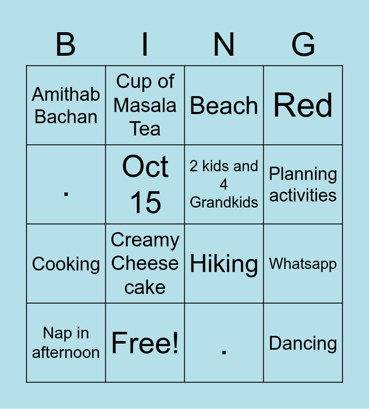 This bingo card has 28 words: Siblings - 8, Rekha, Cooking, Americas got talent, Oct 15, Beach, Cup of Masala Tea, Dancing, Free!, Votes every election, Hiking, Red, Rock Climbing, Reading books, Creamy Cheese cake, Bill Clinton, Play Bridge, 2 kids and 4 Grandkids, Planning activities, Yoga, Amithab Bachan, Mexican food, Nap in afternoon, Whatsapp, ., ., . and ..