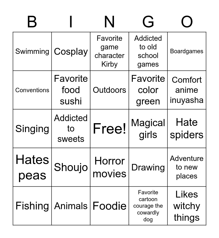 This bingo card has a free space and 24 words: Shoujo, Animals, Outdoors, Fishing, Boardgames, Swimming, Conventions, Cosplay, Magical girls, Horror movies, Favorite color green, Singing, Drawing, Adventure to new places, Favorite food sushi, Favorite cartoon courage the cowardly dog, Hate spiders, Favorite game character Kirby, Comfort anime inuyasha, Addicted to sweets, Likes witchy things, Hates peas, Addicted to old school games and Foodie.