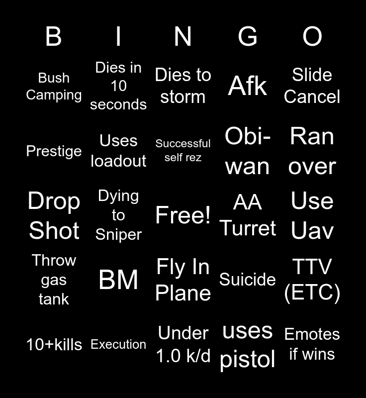 This bingo card has a free space and 24 words: 10+kills, BM, Successful self rez, uses pistol, Slide Cancel, Bush Camping, Dies in 10 seconds, Dies to storm, AA Turret, Use Uav, Drop Shot, Uses loadout, Suicide, TTV (ETC), Prestige, Execution, Under 1.0 k/d, Afk, Ran over, Throw gas tank, Dying to Sniper, Fly In Plane, Obi-wan and Emotes if wins.