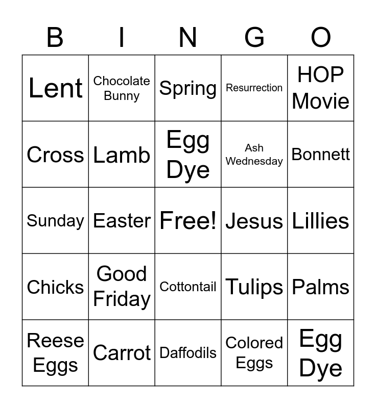 This bingo card has a free space and 24 words: Good Friday, Carrot, Egg Dye, Reese Eggs, HOP Movie, Lent, Cross, Chocolate Bunny, Jesus, Cottontail, Ash Wednesday, Sunday, Tulips, Palms, Lamb, Colored Eggs, Lillies, Spring, Bonnett, Easter, Egg Dye, Chicks, Resurrection and Daffodils.