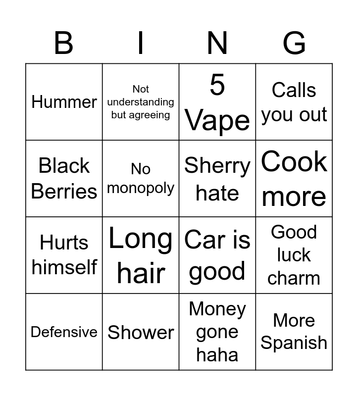 This bingo card has 16 words: Shower, Good luck charm, 5 Vape, Hummer, Hurts himself, Not understanding but agreeing, Car is good, Money gone haha, Black Berries, No monopoly, Defensive, Calls you out, Long hair, Cook more, Sherry hate and More Spanish.