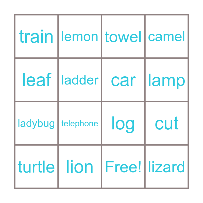 This bingo card has 17 words: Free!, turtle, towel, train, telephone, camel, cut, car, lamp, ladder, lion, log, leaf, lemon, ladybug, leopard and lizard.
