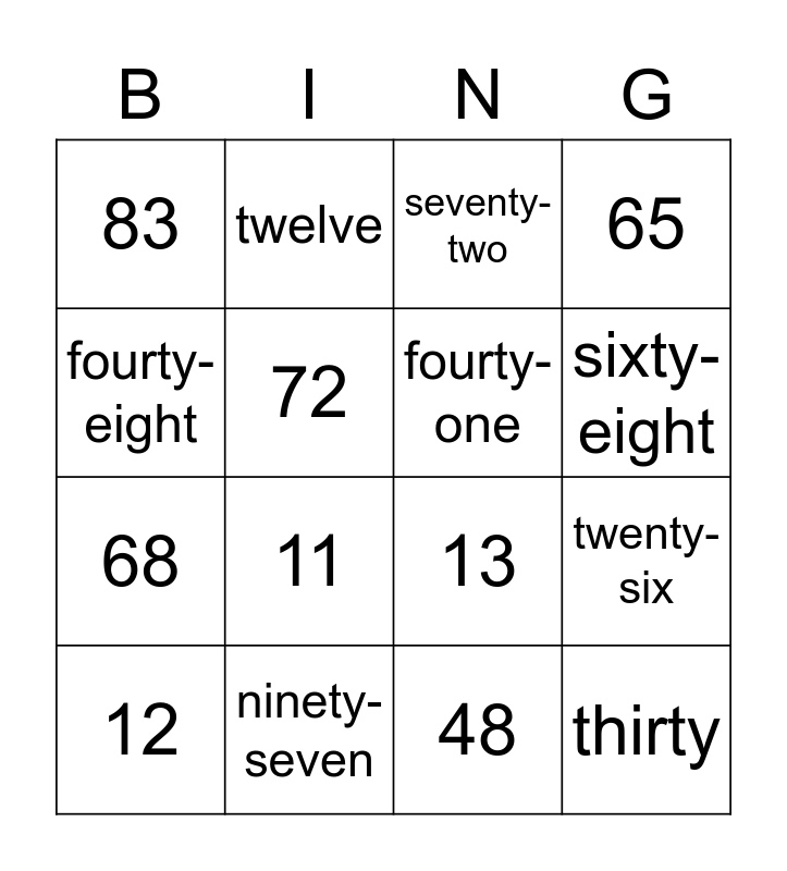 This bingo card has 32 words: eighteen, thirteen, twenty-six, thirty-nine, thirty, fourty-one, fourty-eight, fifty-three, twelve, sixty-five, sixty-eight, seventy-two, eighty-three, a hundred, ninety-seven, eleven, 18, 13, 26, 39, 30, 41, 48, 53, 12, 65, 68, 72, 83, 100, 97 and 11.