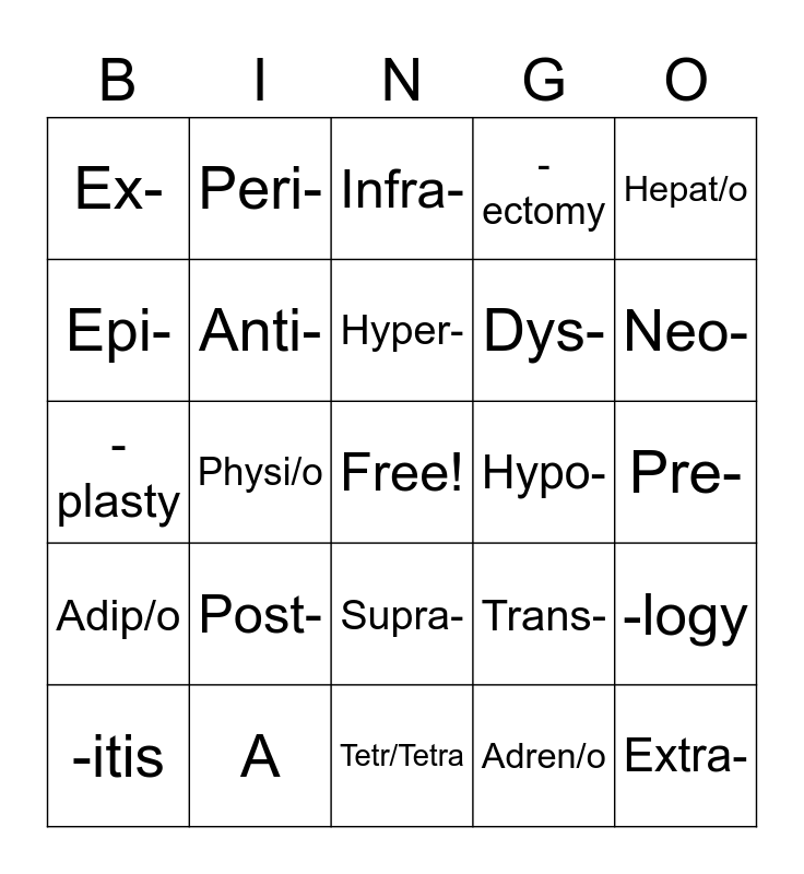This bingo card has a free space and 59 words: Ab-, A, Aden/o, Adip/o, Adren/o, An-, Anti-, Bi-, Dys-, Ecto-, -ectomy, Endo-, Epi-, Eti/o, Eu-, Ex-, Extra-, Hepat/o, Hist/o, Hyper-, Hypo-, Infra-, -itis, -logy, -logist, -megaly, Meta-, Mono-, Neo-, Oligo-, Pan-, Pancreat/o, Path/o, Per-, Peri-, -pexy, Pineal/o, Physi/o, Pituit/o, -plasty, Poly-, Post-, Pre-, Quadri-/Quadro, Spleen/o, -stomy, Sub-, Super-, Supra-, Tetr/Tetra, Thym/o, Thyr/o, Thyroid/o, -tomy, Tonsil/o, Trans-, Tri-, Ultra- and Uni-.