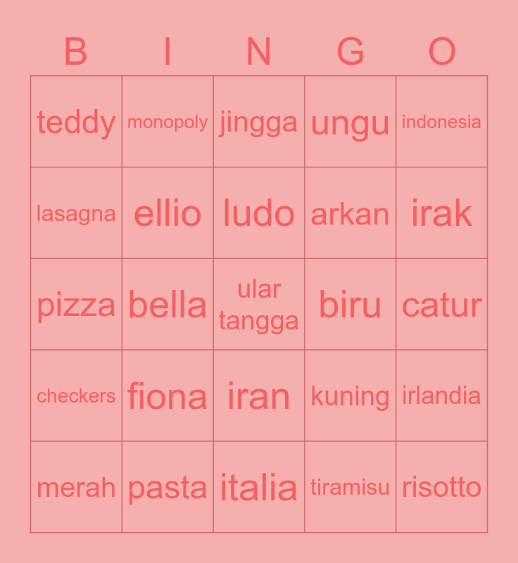 This bingo card has a free space and 24 words: fiona, pasta, ludo, merah, indonesia, teddy, lasagna, monopoly, biru, iran, arkan, pizza, kuning, irlandia, ellio, tiramisu, catur, jingga, irak, bella, risotto, checkers, ungu and italia.