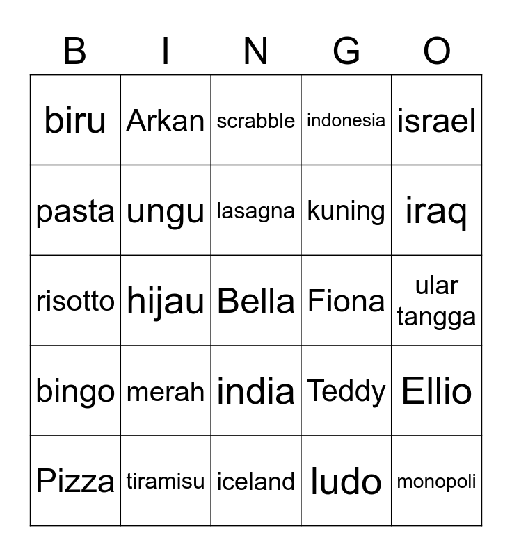 This bingo card has a free space and 24 words: merah, tiramisu, lasagna, Pizza, israel, biru, pasta, Arkan, Fiona, india, kuning, risotto, Teddy, Ellio, ungu, ludo, ular tangga, scrabble, iraq, hijau, monopoli, bingo, indonesia and iceland.