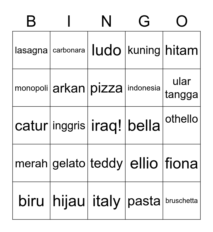 This bingo card has a free space and 24 words: gelato, hijau, pizza, biru, hitam, lasagna, monopoli, carbonara, bella, teddy, indonesia, catur, ellio, fiona, arkan, pasta, othello, ludo, ular tangga, inggris, bruschetta, merah, kuning and italy.