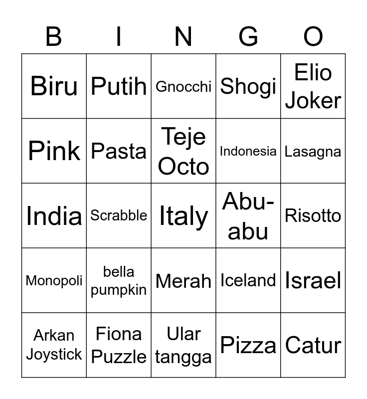 This bingo card has a free space and 24 words: bella pumpkin, Fiona Puzzle, Teje Octo, Arkan Joystick, Elio Joker, Biru, Pink, Putih, Abu-abu, Merah, Indonesia, India, Iceland, Israel, Pasta, Pizza, Risotto, Gnocchi, Lasagna, Scrabble, Catur, Monopoli, Shogi and Ular tangga.