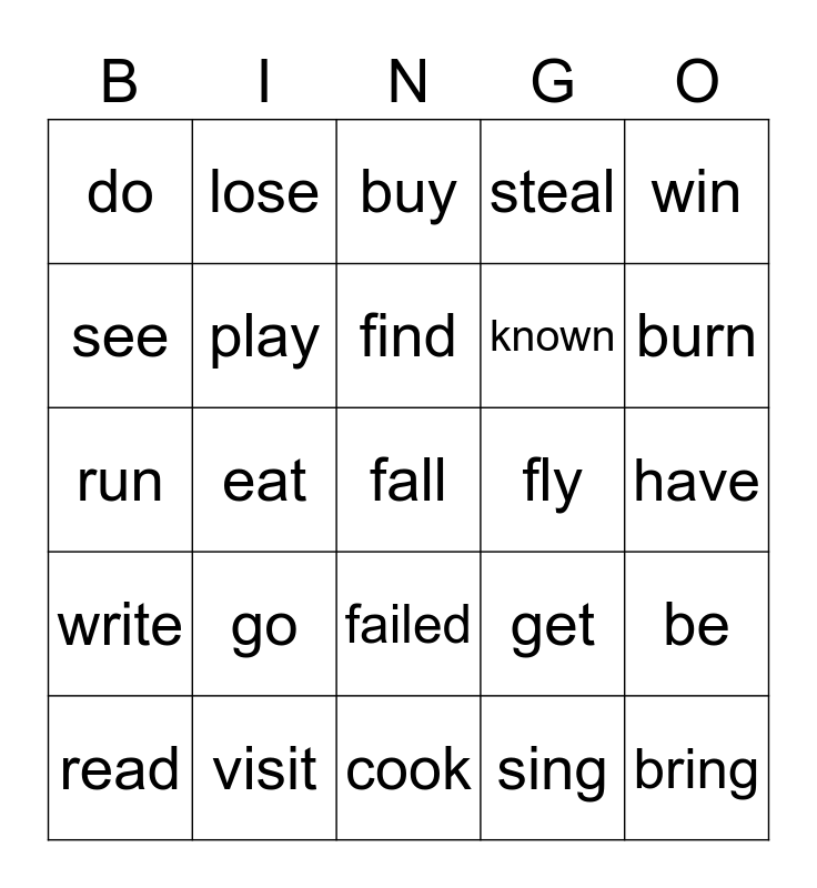This bingo card has a free space and 24 words: go, visit, find, read, win, do, see, lose, fly, failed, known, run, get, be, play, sing, have, buy, burn, eat, bring, write, steal and cook.