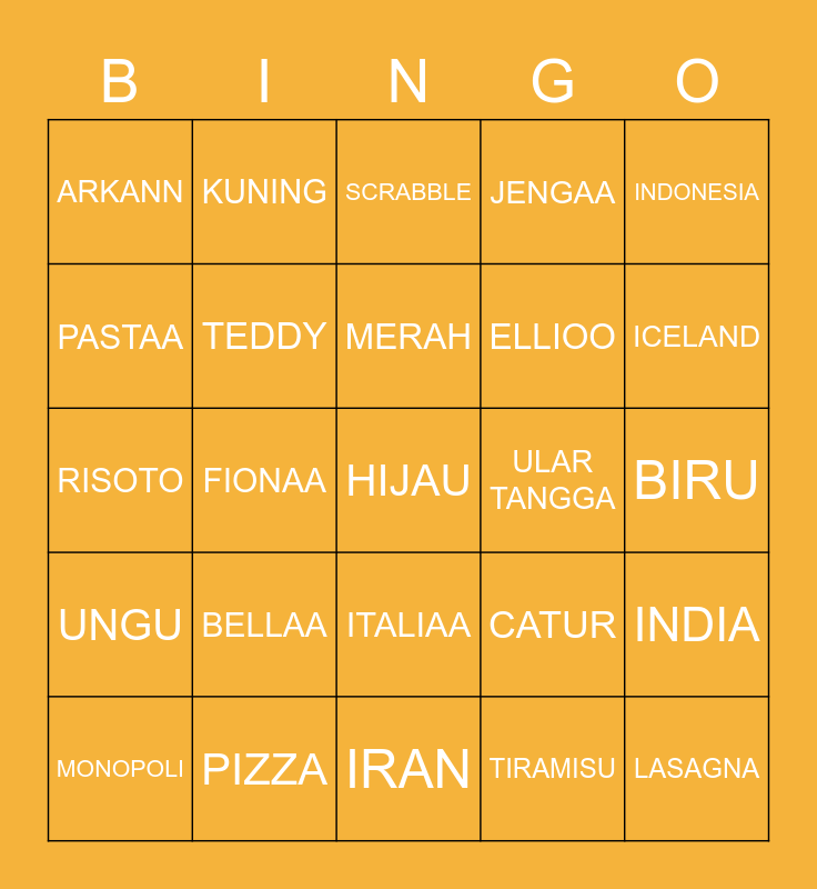 This bingo card has a free space and 24 words: BELLAA, PIZZA, MERAH, MONOPOLI, INDONESIA, ARKANN, PASTAA, KUNING, ULAR TANGGA, ITALIAA, ELLIOO, RISOTO, CATUR, INDIA, TEDDY, TIRAMISU, BIRU, SCRABBLE, ICELAND, FIONAA, LASAGNA, UNGU, JENGAA and IRAN.
