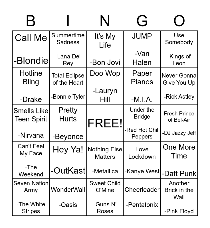 This bingo card has a free space and 24 words: Hey Ya! -OutKast, WonderWall -Oasis, Doo Wop -Lauryn Hill, Seven Nation Army -The White Stripes, Use Somebody -Kings of Leon, Call Me -Blondie, Hotline Bling -Drake, Summertime Sadness -Lana Del Rey, Under the Bridge -Red Hot Chili Peppers, Nothing Else Matters -Metallica, Paper Planes -M.I.A., Smells Like Teen Spirit -Nirvana, Love Lockdown -Kanye West, One More Time -Daft Punk, Total Eclipse of the Heart -Bonnie Tyler, Cheerleader -Pentatonix, Fresh Prince of Bel-Air -DJ Jazzy Jeff, It's My Life -Bon Jovi, Never Gonna Give You Up -Rick Astley, Pretty Hurts -Beyonce, Another Brick in the Wall -Pink Floyd, Can't Feel My Face -The Weekend, JUMP -Van Halen and Sweet Child O'Mine -Guns N' Roses.