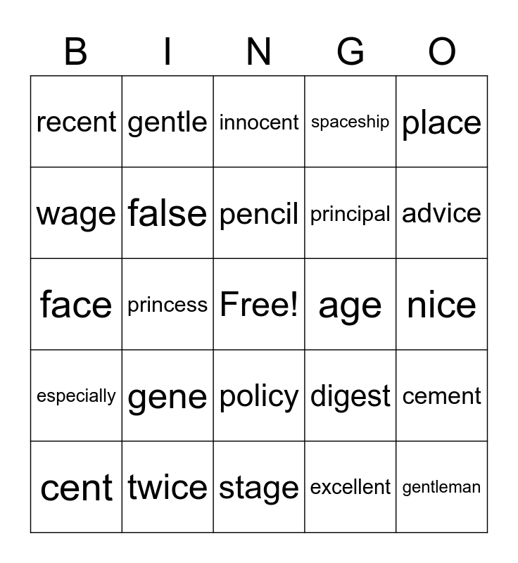 This bingo card has a free space and 34 words: necessary, excellent, police, special, especially, false, place, cent, gentle, mice, pencil, innocent, cell, agent, age, advice, twice, face, gene, digest, policy, city, recent, nice, stage, gentleman, spaceship, license, principal, wage, specific, princess, cement and rice.
